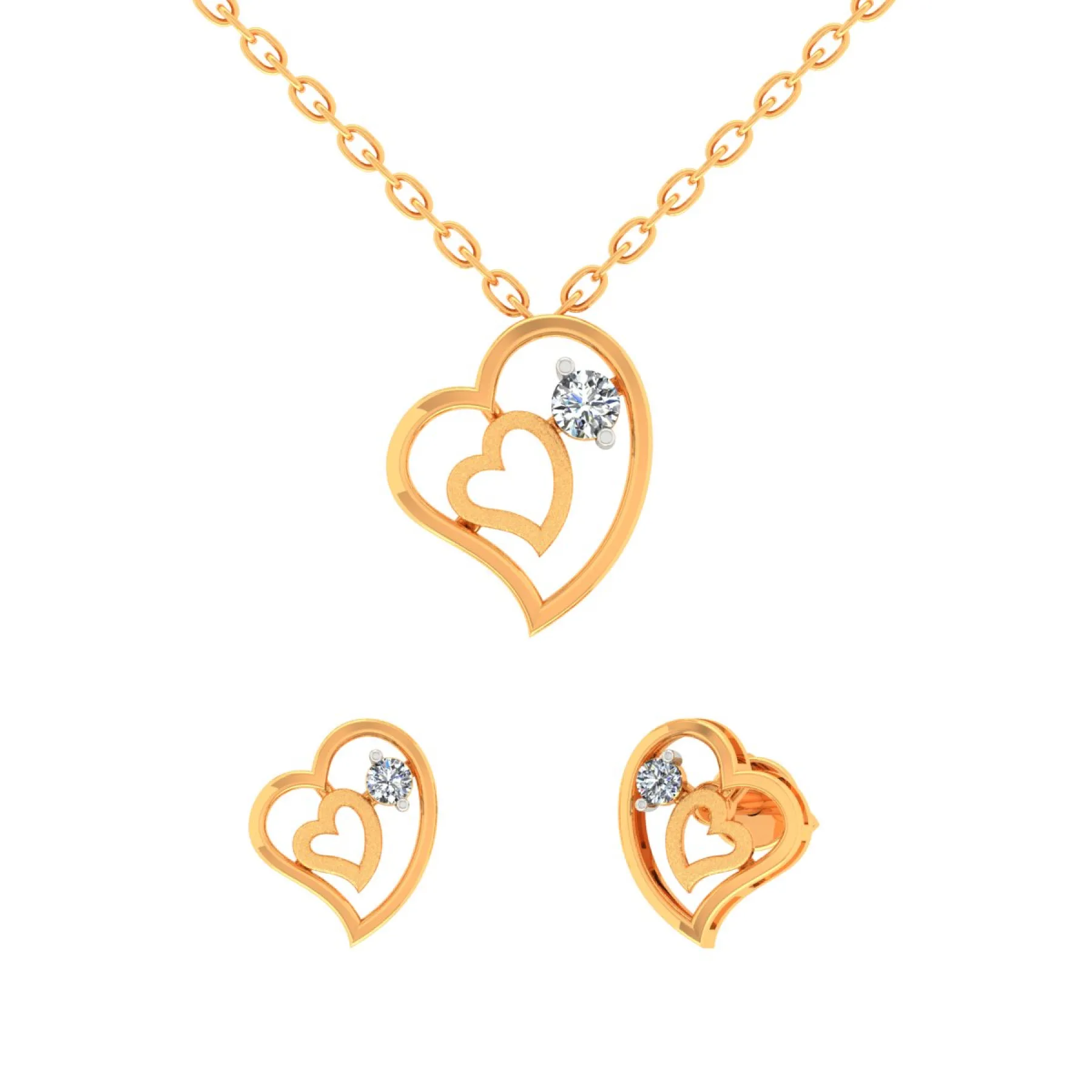 This Solitaire Chain Set is a study in modern, minimalist elegance. A brilliant round-cut diamond is the singular focus, held securely in an open bezel setting. The accompanying delicate gold chain enhances the stone’s radiance and clarity. A luxurious, understated piece designed for timeless, everyday sophistication.